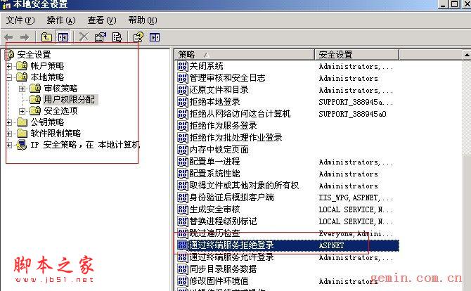 点左边的本地策略,再点用户权限分配,再双击右边的拒绝通过远程桌面服务登陆,