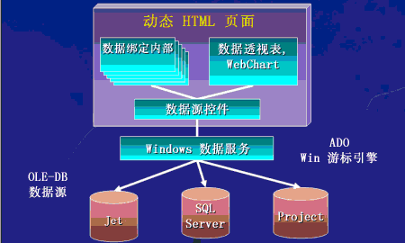 此外还有一个数据源控件,负责在那些控件上设置诸如数据源和数据字段这样的 Internet Explorer 数据绑定属性。数据访问页使用 Internet Explorer 中的许多强大功能,因此只需设置属性便可以实现这些丰富的数据绑定功能。Microsoft Windows® 数据服务(如 ADO 和 OLE DB 游标引擎)可用于进行数据连接和将数据下载到本地。