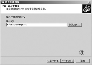 弹出“FTP站主目录”对话框,在“路径”文本框中输入主目录的路径,然后单击[下一步]按钮(如图3)。