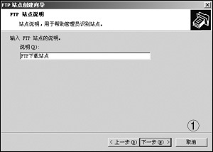 用鼠标右键单击服务器节点,从弹出的快捷菜单中选择[新建]→[FTP站点]命令,打开“欢迎使用FTP站点创建向导”对话框,然后单击[下一步]按钮,弹出“FTP站点说明”对话框,在“说明”文本框中输入站点的说明文字,比如“FTP下载站点”,然后单击[下一步]按钮(如图1)。