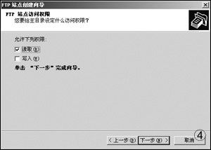 打开“FTP站点访问权限”对话框,FTP站点只有两种访问权限:读取和写入。前者对应下载权限,后者对应上传权限,单击[下一步]继续(如图4)。在最后弹出的对话框中单击[完成]按钮,完成站点的创建。