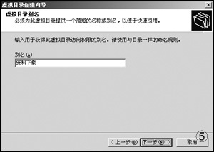 打开虚拟目录创建向导并单击[下一步]按钮,在“虚拟目录别名”对话框中的“别名”文本栏中指定虚拟目录别名,比如“资料下载”(如图5)。