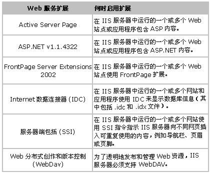 表 6 列出了预定义的 Web 服务扩展,并提供了何时启用每个扩展的详细信息。
