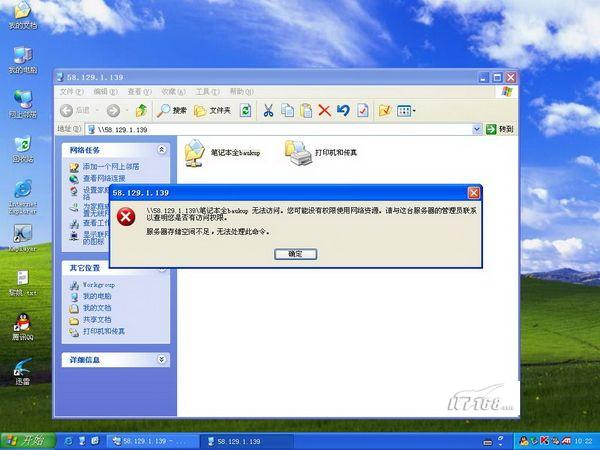 接下来笔者测试网络访问连通性,在员工计算机上ping服务器IP地址一切正常,访问服务器时也出现了用户名密码输入提示窗口,对应的帐户信息也通过了服务器自身验证。由于员工计算机上administrator帐户对应的是空密码,笔者记得在XP系统互相访问时有过禁止空密码访问的设置参数,于是笔者将员工计算机的administrator密码进行了添加,设置为和服务器一模一样,再次访问问题依然没有解决,还是出现“服务器存储空间不足,无法处理此命令 (Not enough server storage is available to process this command)”的错误提示。