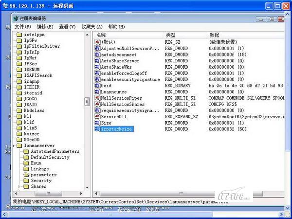 第三步:查找IRPStackSize值,如果“IRPStackSize”值尚不存在,则在注册表的 Parameters 文件夹中,右健单击右窗格指向“新建”,然后单击“DWord 值”,键入IRPStackSize。