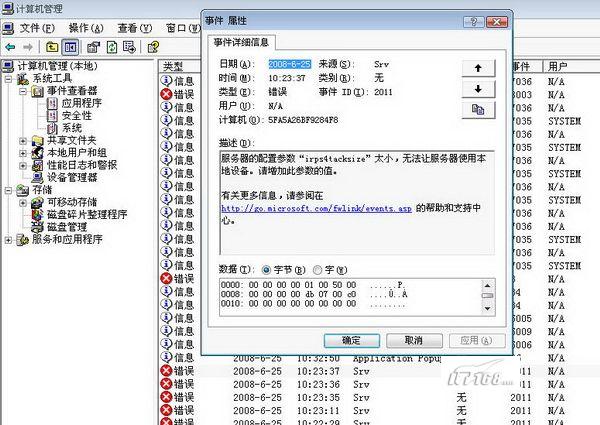 为了定位故障笔者查询了服务器上的事件查看器,查日志时发现有错误记录“事件ID 2011,服务器的配置参数“irps4tacksize”太小,无法让服务器使用本地设备。请增加此参数的值”,接下来笔者到微软站点查询其知识库终于在这里找到了答案,原来在http://support.microsoft.com/?kbid=177078中明确写了“服务器存储空间不足,无法处理此命令 (Not enough server storage is available to process this command)”是因为防病毒软件导致的,涉及到的防病毒软件有Norton AntiVirus for Windows 或 IBM AntiVirus 3.01N,不过笔者并没有安装这些杀毒软件,使用的是卡巴斯基。不过故障现象是一样的,都是因为服务器的配置参数“IRPStackSize”太小,于是笔者按照上面提示的解决办法进行了操作。(如图3)