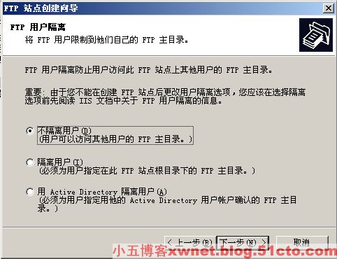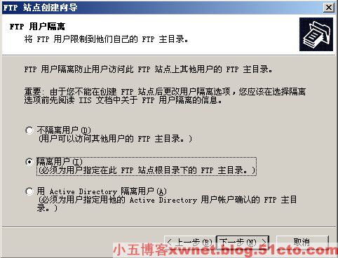 三、创建隔离用户FTP 1)参照创建不隔离用户FTP第一到第三步,修改第一步的名称为不隔离用户 2)选择隔离用户  3)参考创建不隔离用户FTP的第五到第六步  123下一页 |