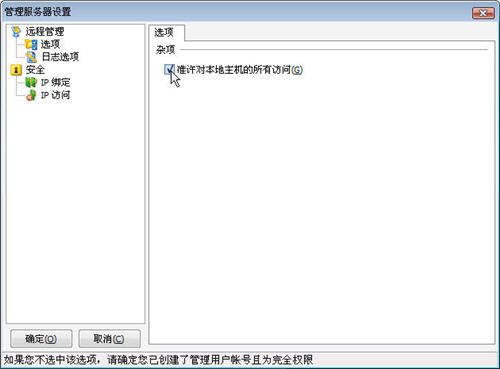 第一步:在服务器上打开GENE的管理服务器设置属性,选择“远程管理”下的“选项”,这里有一个“准许对本地主机的所有访问”,我们将其选中,确认保存退出。(如图4)