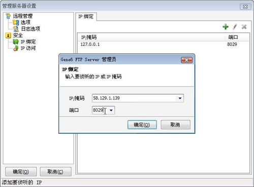 第二步:另外依然在服务器的GENE管理服务器设置属性中,找到“安全”下的“IP绑定”设置,这里要添加服务器的IP地址,包括本机127.0.0.1以及自己的公网IP地址信息,记得端口号要填写正确,确定后退出。(如图5)