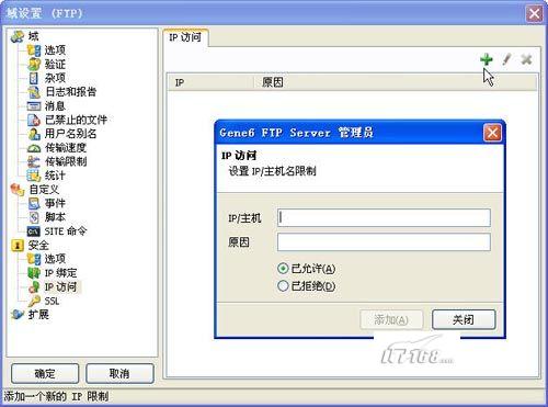 FTP的访问是需要授权的,默认情况下任何IP地址都可以直接访问FTP服务器,这是非常不安全的,特别是对于很多企业来说,服务器具备外网IP地址,那么有效的限制外部网络对服务器的访问是提高安全的基础,在Gene6中我们可以对IP访问进行设置,具体方法是在“站点名称”上点右键选择“属性”,在站点属性窗口左边找到“安全”->“IP访问”,然后在弹出的窗口中输入我们容许或者拒绝访问的IP地址,当然也可以设置IP地址段。(如图24)