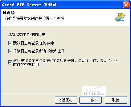 第五步:设置域向导中的日志记录相关信息,包括是否记录任何事件,是否记录下载和上传事件,是否显示5分钟,1小时,24小时带宽使用图标。选中这些功能能够有利于我们解决实际问题,特别是出现故障和FTP服务运行缓慢时快速解决难题。(如图13)