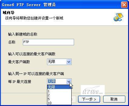 第三步:在“域”建立向导中我们添些FTP服务的名称以及针对最大客户端连接数和每个IP最大连接数进行设置,点“下一步”按钮继续。(如图11)
