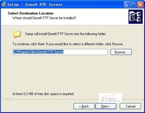 第三步:选择Gene6的安装路径,默认是在c:\program files\gene6 ftp server目录下,接下来点NEXT按钮继续。(如图3)
