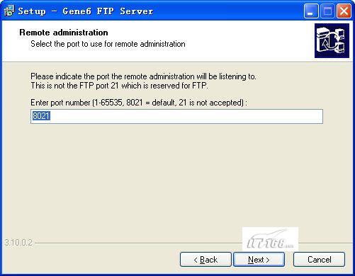 第五步:接下来是对远程管理端使用的端口进行设置,我们可以自定义端口号,默认是8021,除了21端口在传输时使用外我们可以任意选择,不过就笔者经验来说还是保持默认比较好,否则防火墙或其他安全工具会阻止管理端的连接。(如图5)