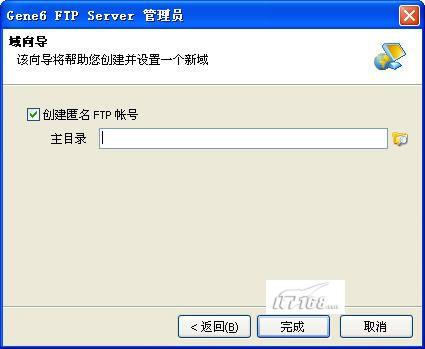 第六步:针对匿名帐户设置其启用状态以及访问目录信息,当然我们也可以禁止匿名帐户的登录,这些都根据实际情况选择即可,最后点“完成”按钮结束FTP域的设置工作。(如图14)