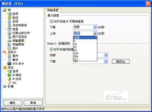 很多时候我们要对客户访问FTP的速度进行设置,不能够无限制的下载和上传,限制速度的方法是在“站点名称”上点右键选择“属性”,在站点属性窗口左边找到“域”->“传输速度”,在这里可以对登录FTP下载数据和上传数据的速度进行设置和限定。(如图22)