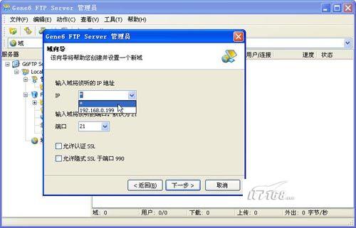 第四步:接下来是设置域IP地址,我们可以手工输入也可以通过下拉菜单选择。在这里笔者建议各位通过下拉菜单选择“*”,这个代表域IP地址为本机任何可用IP信息,如果选择具体数值例如192.168.0.199的话,那么如果服务器有双网卡或者需要针对127.0.0.1做本机访问时就会出现无法连接的故障。另外是否容许SSL加密方式连接FTP我们也可以在该界面选择。(如图12)