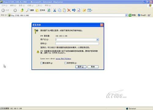 第七步:这时我们打开IE浏览器输入服务器的地址就可以看到FTP登录界面了,由于我们没有添加任何具备登录权限的帐号,所以无法进入指定目录,当然如果开启了匿名登录的话还是可以访问的。(如图15)