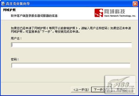 即花生壳客户端,下载:http://www.oray.net/Products/PeanutHull_Support.asp。下载完成后同样按提示安装,在到如下图的步骤时,请输入我们刚才在网站上注册的帐户及密码。