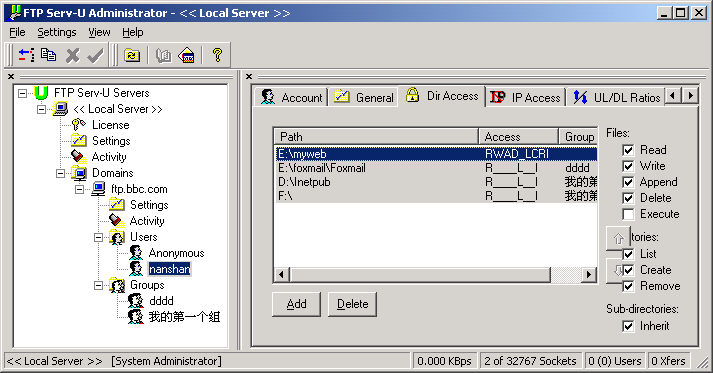 ⑶设置“Dir Access”(目录存取权限):在此处选“Add”(增加)增加目标目录(可多个),然后再为它们逐个设置存取权限。本项具体设置请参见本教程后文相关内容。