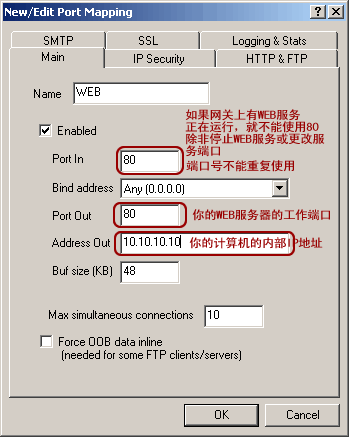图中Port In填的端口号是80,这样填的前提是网关(代理服务器)上没有WEB服务器在运行,否则请更换其它端口,例如“8080”(在这种情况下,用户必须通过http://<你的域名>:8080来访问你的网站。)