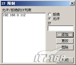 在typsoft ftp中也内置了一个IP过滤设定功能,我们可以将非法IP进行屏蔽,不容许这些IP地址的计算机访问FTP服务器。方法是在主界面中选择“设定”菜单->“IP限制”,然后将希望过滤的地址添加到“容许/拒绝的IP列表”中。(如图18)
