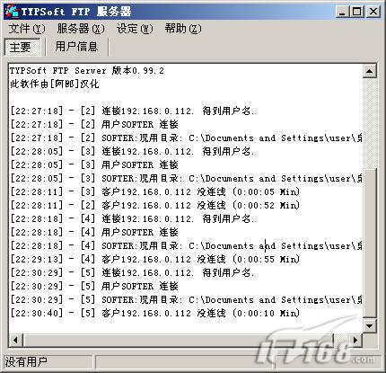 和SERV-U不同的是我们在typsoft ftp中查看用户登录等信息是非常简单的,在主界面中就可以一览无余,常见的用户名和IP地址以及当前目录都能清晰的显示出来。(如图11)