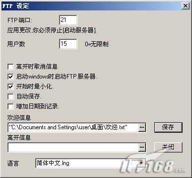 我们可以自定义FTP服务器的欢迎信息,甚至可以为每个不用的用户设置不同的欢迎信息。首先我们要建立一个TXT文本文件,然后把需要显示的欢迎信息填写到这个TXT文件中。接着在主菜单中选择“设定”菜单中的“设置”,在FTP设定界面中的欢迎信息处通过右边的“...”按钮选择刚刚建立的TXT文本文件。点保存后生效。(如图16)