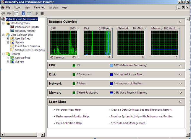 图1 Windows Server 2008可靠性与性能监测器系统资源视图