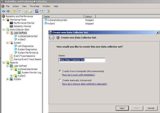 如图2、3所示,我可以通过向导创建系统数据搜集组,也可以把性能监测器的当前配置结果保存为新的系统数据搜集组。