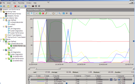 Windows Server 2008 可靠性与性能监测器整合了服务器性能优化建议工具的诊断报表功能(在Windows Server 2003中,优化建议工具是需要单独下载的)。通过诊断报表,可以快速显示任一性能数据搜集组的日志内容;通过其缩放功能,可以方便地查看任意时段的性能曲线,从而准确评估优化措施对性能的实际影响。