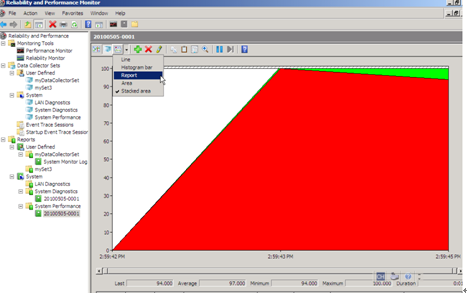 Windows Server 2008系统诊断报表的界面与Windows Server 2003性能监测器的系统性能监视界面类似。值得一提的是,打开Windows Server 2008的诊断报表后,我们可以选定时间段进行缩放以便更仔细的查看性能数据。另外,诊断报表还提供了多种数据展现形式用以全面分析性能数据日志。如图4、5所示。