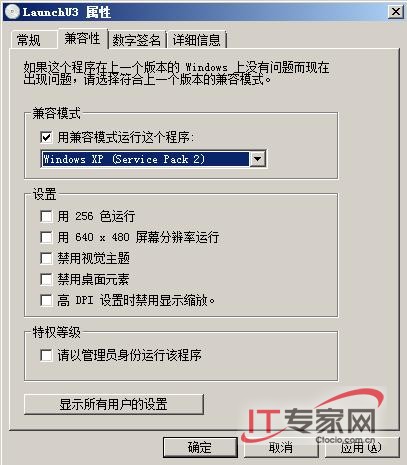 其次在目标文件属性设置窗口中单击“兼容性”选项卡,进入如图3所示的选项设置页面,在其中的“兼容模式”位置处,将“用兼容模式运行这个程序”复选项选中,并且单击对应选项下面的下拉按钮,再从其后出现的下拉列表中将“Windows XP(Service Pack2)”选项选中,或者根据实际需要选中其他合适的选项;