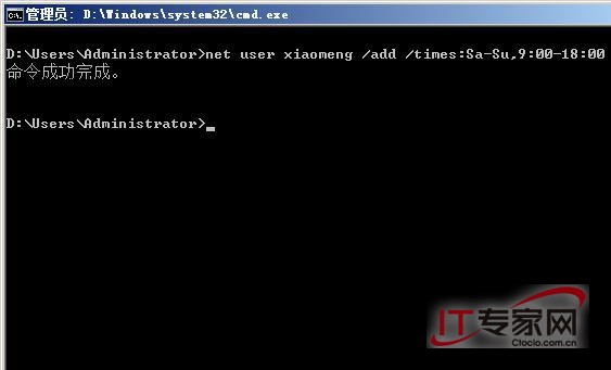 其次在该工作窗口的命令提示符下,正确输入“net user xiaomeng /add /times:sa-su,9:00-18:00 ”字符串命令,单击回车键后,系统屏幕上会返回“命令成功完成”的提示信息(如图1所示),这就意味着Windows Server 2008系统服务器已经成功在本地创建了一个“xiaomeng”账号,日后员工使用该账号访问Windows Server 2008服务器系统时,只能在星期六到星期天的9:00-18:00这段时间进行,其他时间是无权访问Windows Server 2008系统服务器的,如此一来我们就巧妙地利用Windows Server 2008系统的“net use”命令成功实现了传统的家长控制功能。