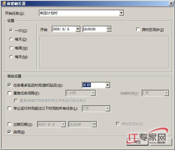 下面继续点选创建任务对话框中的“触发器”选项卡,同时单击对应选项设置页面中的“新建”按钮,打开新建触发器设置窗口(如图2所示),在这里笔者从“设置”处选中“一次”,并且从“高级设置”位置处将“任务最多延迟时间(随机延迟)”功能选项选项,同时把延迟的时间选择为“30分钟”,当然我们还可以在这里随心所欲地将延迟时间修改得更长一些,例如要将延迟时间修改为10天时,直接在“任务最多延迟时间(随机延迟)”文本框中输入“10天”;此外,我们还需要在这里设置好目标任务开始运行的时间,例如我们可以将当前任务计划的运行时间设置为“2009/6/6下午6点钟”。