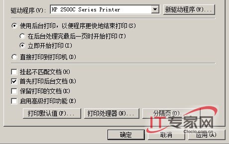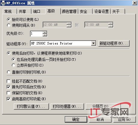 (2).检测打印管理配置。在打印管理控制台中用鼠标右键单击打印机,选择“属性”打开打印机的属性对话框,然后切换到“高级”选项卡中选中“在后台打印完最后一页时开始打印”选项,以确保将完整的文档内容传送到打印机之后再打印。(图5)