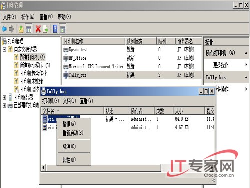 (2).检查打印队列。在打印服务管理器中查看打印机是否被暂停,或者是否有文档发生了错误。如果真是这样,用鼠标右键单击这些文档,选择“取消”命令将其消除。(图1)