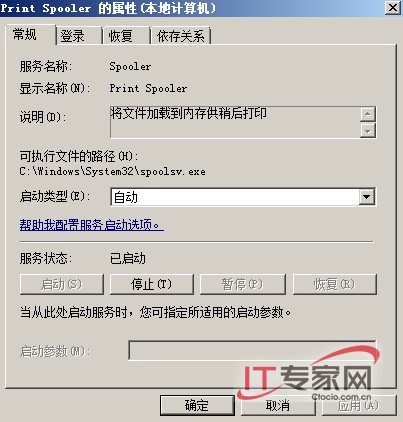 (8).检查Print Spooler服务。将该服务设置为随系统自动启动,但如果在系统启动后,该服务在1分钟之内尝试启动两次连续失败,Print Spooler服务将不再尝试重新启动。同时,如果打印队伍里有错误的文档,而无法将其清除掉,通常都有可能导致Print Spooler服务出错。在这种情况下,我们可首先从打印队伍中清除错误文档,然后打开打印服务控制台,在其中找到Print Spooler服务将其手工启动。(图3)