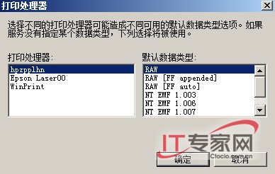(3).检测打印处理器。如果域内或者局域网内客户端的系统类型比较多样的话,检测打印处理器就显得非常必要了。因为基于Windows 98和Windows me的客户端只能使用RAW数据类型的打印处理器进行打印。基于RAW数据类型的打印是在客户端上处理的,因此需要打印服务器处理的工作最少;而EMF数据类型则需要发送大打印服务器进行处理。如果遇到这类错误的话,我们可对打印机的默认数据类型进行修改。打开打印机的属性对话框,切换到“高级”选项卡,然后单击“打印处理器”按钮打开一个对话框,在此我们可以更改当前打印处理器和默认的数据类型。(图4)