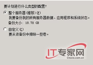 当系统屏幕出现如图2所示的设置对话框时,我们会发现Windows Server 2008系统的Backup功能在默认状态下已经选中了“整个服务器”选项;由于我们现在只想备份服务器操作系统,为此我们可以选中这里的“自定义”选项,从其后出现的设置窗口中选中操作系统所在的磁盘卷,例如笔者在这里选中的是磁盘分区C;