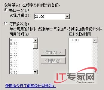 其次选中“自定义”选项,再在其后界面中选中目标数据文件对应的磁盘分区符号,单击“下一步”按钮后,打开如图4所示的向导设置窗口,在这里我们可以根据时局需要对数据备份操作的执行时间以及备份频率进行合适的设置,一般来说我们应该尽量将备份任务计划的执行时间设置在下班时间或计算机处于空闲状态的时间;