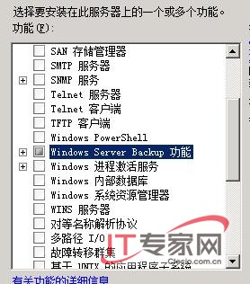 其次看看该向导窗口中的Backup功能组件有没有被选中,如果没有选中的话,那就说明Windows Server 2008系统中的Backup功能还没有安装成功,此时我们可以重新选中Backup功能组件,再单击“下一步”按钮,之后依照默认提示不停单击“下一步”按钮,直到完成目标系统组件的安装操作。
