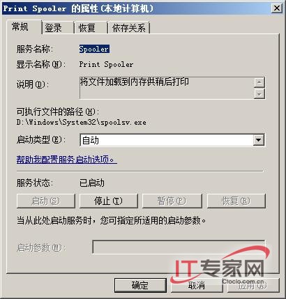 其次从该控制台窗口的左侧列表区域处依次展开“配置”/“服务”节点选项,从目标节点下面找到Print Spooler服务选项,并用鼠标双击该选项,打开如图4所示的目标系统服务属性设置对话框,在其中的“常规”标签页面中,我们检查一下该系统服务的工作状态是否正常,如果不正常的话,那打印机驱动程序不能安装的故障肯定是该系统服务引起的,此时我们只要单击这里的“启动”按钮,将目标系统服务重新启动正常就可以解决问题了;