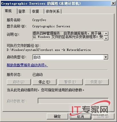 其次从该控制台窗口的右侧显示区域中,用鼠标双击“Cryptographic Services”系统服务,打开目标系统服务的属性设置窗口,点选其中的“常规”选项卡,打开如图6所示的选项设置页面,在这里我们可以很清楚地看到该系统服务此时此刻的启动状态。通常情况下,某个设备的驱动程序要是不能通过Windows系统的徽标测试时,往往是“Cryptographic Services”服务工作状态不正常引起的;此时,我们可以在这里单击“启动”按钮,先将目标系统服务启动成功,之后再将它的启动类型参数修改为“自动”,最后单击“确定”执行参数设置保存操作,如此一来我们就能成功解除系统徽标测试限制了。