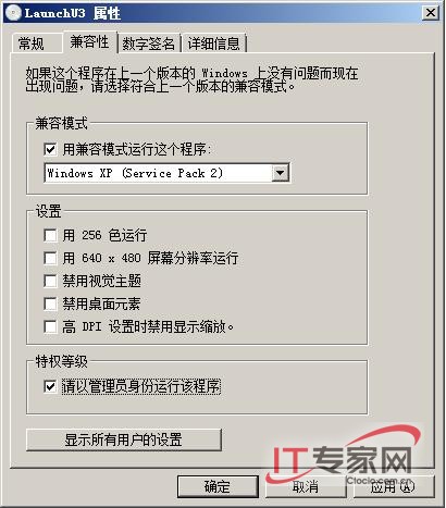 由于多数设备驱动安装文件都是基于Windows XP系统环境开发的,为了能让Windows Server 2008系统“接纳”这种类型的驱动文件,我们必须在这里的“兼容性”位置处将“用兼容模式运行这个程序”项目选中,同时打开对应该项目下面的下拉列表,从中选择“Windows XP(Service Pack 2)”选项;