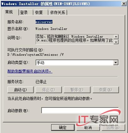 其次从该控制台窗口的左侧列表区域处依次展开“配置”/“服务”节点选项,从目标节点下面找到Windows Installer服务选项,并用鼠标双击该选项,打开如图2所示的目标系统服务属性设置对话框,在其中的“常规”标签页面中,我们检查一下该系统服务的工作状态是否正常,如果不正常的话,那设备驱动程序不能安装的故障肯定是该系统服务引起的,此时我们只要单击这里的“启动”按钮,将目标系统服务重新启动正常就可以解决问题了;