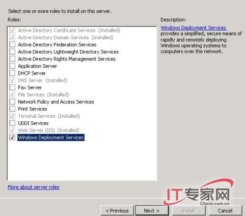 下面开始WDS的安装。以AD管理员登录DC,打开服务管理器(Server Manager),激活角色(Roles)项进行角色的添加。单击“添加角色(Add Roles)”,启动添加角色向导并显示开始之前(Before You Begin)页面。单击“下一步”在显示的组件列表中,向下拖动找到并选中“Windows Deployment Servers”项。接下来单击“下一步”三次,接收每页的(Overview of WDS,Select Role Services,Confirm Installation Selections)的默认设置。最后单击“安装”进行组件的安装,安装完成后单击“关闭”即可。需要说明的是,WDS安装完成后,服务器并不需要重启。(图1)
