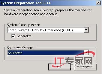 添加系统映像前还需要创建操作系统映像。为此我们需要一台裸机用于创建系统映像。在该裸机上安装安装操作系统,Windows Vista、WindowsServer 2008、Windows XP或Windows Server 2003均可,本文针对Windows Vista和Windows Server 2008。系统安装完成后,根据需要进行必要的配置。下面,我们要用到一个工具Sysprep,进行机器的准备工作。Sysprep用于删除所有独特的识别信息(例如计算机名和IP配置信息)。单击“开始”并选择“运行”,输入Sysprep并回车。然后弹出Sysprep对话框中,选中Generalize复选框,并从Shutdown Options下拉菜单中选择Shutdown,单击OK。当Sysprep完成后,计算机将会关闭。(图5)