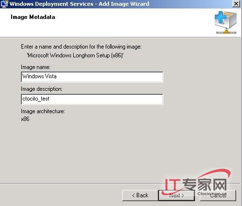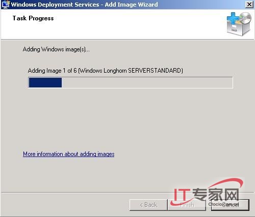 启动映像制作完毕后,我们就可以向WDS服务器添加新的启动映像了。打开打开WDS管理单元,并展开Servers节点,然后展开服务器。右键单击Boot Images并选择Add Boot Image。在Image File页面中,浏览找到启动映像文件,为例为C:\winp\winpe.wim,单击“下一步”。在Image Metadata页面中,我们可以添加映像的名称和描述,然后单击“下一步”。在本示例中,我们为此映像命名为“Create Image”。然后可在Summary页面中检查有关设置,如果一切正常,单击“下一步”。如果任务进度条显示0peration Complete,单击“完成”即可。其上面操作完成后,可在在结果面板的列表中应该出现新启动映像。接下来,需要添加第二个启动映像,我们可以在Vista(或Windows Server 2008)DVD中的Sources文件夹下查找该映像。按照上面步骤添加启动映像,但这次浏览Vista DVD\Sources文件夹,选择boot.wim,将其命名为“Deploy Image”。(图4)