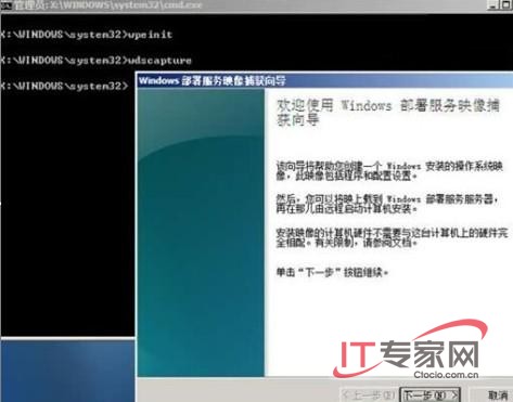 接下来,在此机器上执行网络启动(PXE启动)。重启计算机,做好执行网络启动的准备。有些机器需要按FI2(有些按F2,还有其它网络启动的指定按键。如果没有出现执行网络启动的选项,可能需要更改系统的BIOS设置,以包含网络启动项)。当然主机从DHCP服务器获取lP地址时,屏幕将会保持黑屏状态。随后系统将会提示“PressFI2 for Network Service Boot”。从添加到WDS服务器的启动映像选择项中,选择Create Image。启动Create Image后,将看到黑色的类似命令行的屏幕。在X:\Windows\system32>命令提示符下,键入Wdscapture,将出现映像捕捉欢迎屏幕。(图6)
